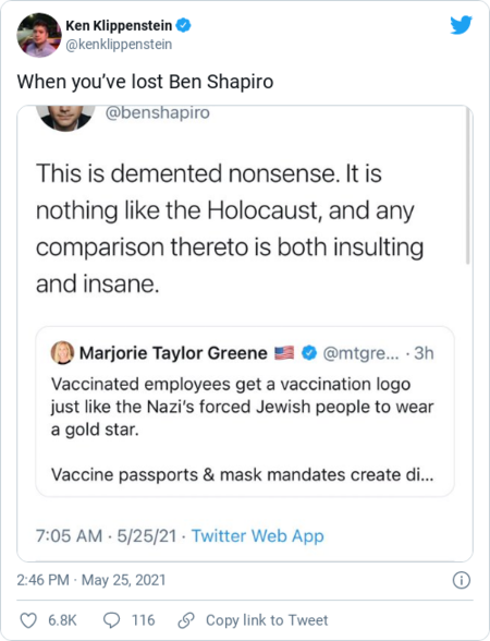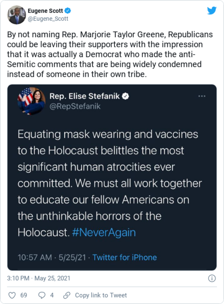 Relatives stand next to the burning pyre of a man who died from the coronavirus during his cremation at a crematorium ground in Srinagar. (Danish Ismail/Reuters) | | | | Covid-19 risk for unvaccinated people, visualized The country's declining covid-19 case rates present an unrealistically optimistic perspective for half of the nation that is still not vaccinated. The Washington Post adjusted its case, death and hospitalization rates to account for the unprotected population and found that in some places, the virus continues to rage among those who haven't received a shot. See what the data looks like in your state. | | | Hot on the right Rep. Marjorie Taylor Greene (R-Ga.) drew a rebuke not only from Democrats but also members of her own party after she continued to press comparisons of masking policies to Nazi Germany. This morning, House Minority Leader Kevin McCarthy (R-Calif.) said Greene is "wrong, and her intentional decision to compare the horrors of the Holocaust with wearing masks is appalling." McCarthy also said the House Republican conference "condemns" the language used by Greene, John Wagner reports. "In a morning tweet on Tuesday, Greene linked to a news story about a Knoxville, Tenn., grocery store at which fully vaccinated employees will have a vaccination logo displayed on their name badge and be allowed to go maskless. 'Vaccinated employees get a vaccination logo just like the Nazi's forced Jewish people to wear a gold star,' Greene wrote." Other Republicans also criticized Greene's comments: | Some, however, avoided naming her: | | | | | | | Hot on the left The QAnon crowd is convinced UFOs are a diversion from voter fraud. 'There's no doubt that this mainstream UFO disclosure push is offering a convenient distraction for the Deep State to turn our attention away from important issues like the Scamdemic and the election fraud getting exposed,' Jordan Sather, a UFO and QAnon conspiracy theorist, complained on social media network Telegram on May 19," the Daily Beast's Will Sommer reports. "Conspiracy theory hub InfoWars often posts articles about UFOs. But more recently, InfoWars has started to see the prospect of extraterrestrial revelations as a deep state plot. ... The claims that an evil cabal is behind the new wave of interest in UFOs reflects the growing overlap between the UFO 'disclosure' community and other conspiracy theory movements, especially QAnon." | | | Today in Washington Biden and Harris will meet with George Floyd's family at 1:30 p.m. The president will visit Delaware this evening but will return to the White House at night. | | | In closing | Seth Meyers said Rep. Marjorie Taylor Greene's (R-Ga.) comparisons of masking policies to Nazi Germany are "insane" and "grotesque": | | | | | | |