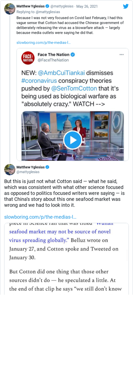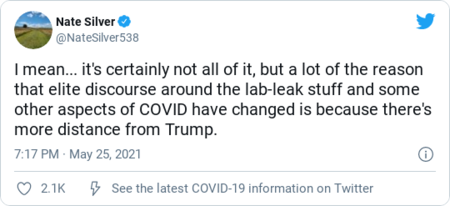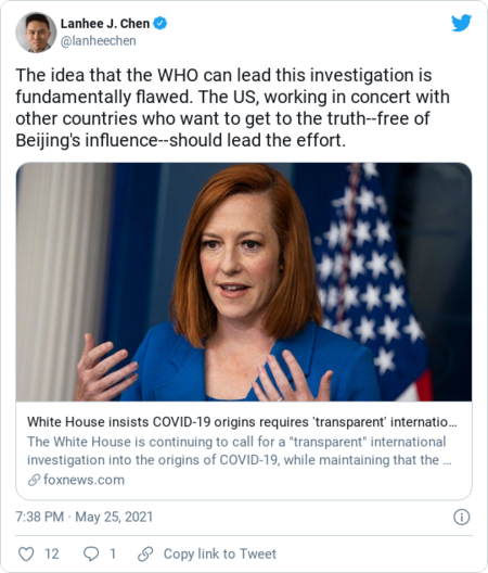 White House press secretary Jen Psaki. (Demetrius Freeman/The Washington Post) | | Hoover Institute fellow Lanhee Chen: | | | | Yet there are no known plans at the assembly to pass a resolution on the matter; WHO officials told the Wall Street Journal that there's "little sign that governments could agree on a path forward." And there's little hope China would comply with the requests, even if the assembly turned up the pressure. "China will never agree to that, of course," Lentzos said, adding that she doubts "a smoking gun" will ever be found. Even so, the new attention on the lab leak hypothesis is prompting introspection among scientists and the media.We still don't know whether the virus emerged "zoonotically" from animals, or whether it was the result of a lab experiment gone awry. "Scientists' default assumption has been that this was a naturally occurring event since hundreds of zoonotic viruses jump from animals to humans and cause all manner of diseases," Yasmeen Abutaleb, Shane Harris and Ben Guarino write. "Many scientists who study zoonotic diseases say that's still the more likely scenario. But in part because they have not yet identified the animal that may have spread the virus to humans, the Wuhan lab theory has gained more credibility." Sen. Tom Cotton (R-Ark.) was widely ridiculed when he first advanced the notion that the virus may have escaped from a lab, rather than jumping from animals to humans at a Wuhan seafood market. Numerous experts dismissed the possibility the virus could be man-made, according to reporting by my colleague Paulina Firozi in February 2020. "There's absolutely nothing in the genome sequence of this virus that indicates the virus was engineered," Richard Ebright, a professor of chemical biology at Rutgers University, said at the time. "The possibility this was a deliberately released bioweapon can be firmly excluded." | Claims from former president Donald Trump that the virus came from a lab also contributed to the skepticism, FiveThirtyEight founder Nate Silver argues: | | | | | Vox writer Matt Yglesias slammed the media for how it dismissed the hypothesis: | | | | Important information was available from the start, but generally ignored, The Post's fact-checker Glenn Kessler writes. "But in other cases, some experts fought against the conventional wisdom and began to build a credible case, rooted in science, that started to change people's minds," he writes. "This has led to renewed calls for a real investigation into the lab's activities before the coronavirus emerged." Glenn has a timeline tracking what we knew, when. Here are a few early-on examples of evidence suggesting the lab-leak hypothesis should have been at least considered. Jan. 26: A study by Chinese researchers published in the Lancet of the first 41 hospitalized patients in Wuhan who had confirmed infections found that 13 of the 41 cases, including the first documented case, had no link to the seafood marketplace that originally was considered the origin of the outbreak. Feb. 6: Botao Xiao, a molecular biomechanics researcher at South China University of Technology, posts a paper stating that "the killer coronavirus probably originated from a laboratory in Wuhan." He pointed to the previous safety mishaps and the kind of research undertaken at the lab. He withdrew the paper a few weeks later after Chinese authorities insisted no accident had taken place. March 27: A Defense Intelligence Agency assessment on the origin of the coronavirus is updated to include the possibility that the new coronavirus emerged "accidentally" because of "unsafe laboratory practices." April 14: Josh Rogin, writing in The Post, reveals that in 2018, State Department officials visited the WIV and "sent two official warnings back to Washington about inadequate safety at the lab, which was conducting risky studies on coronaviruses from bats. The cables have fueled discussions inside the U.S. government about whether this or another Wuhan lab was the source of the virus — even though conclusive proof has yet to emerge." |