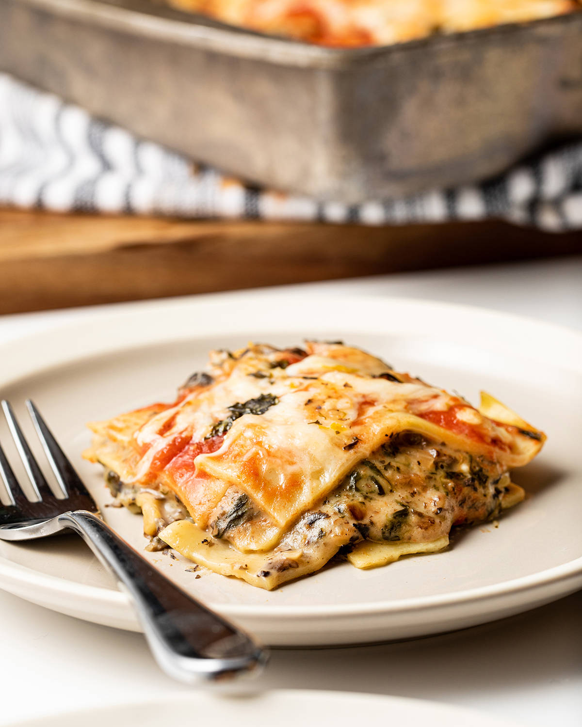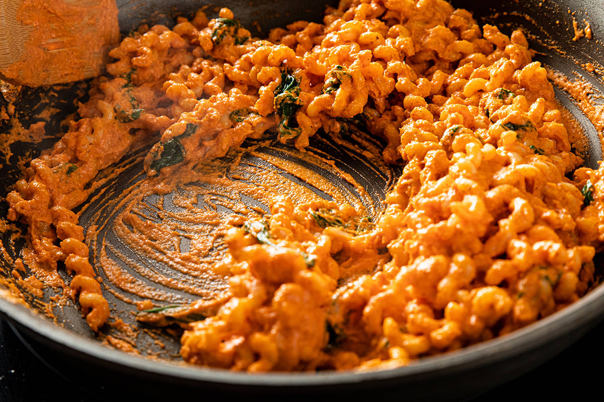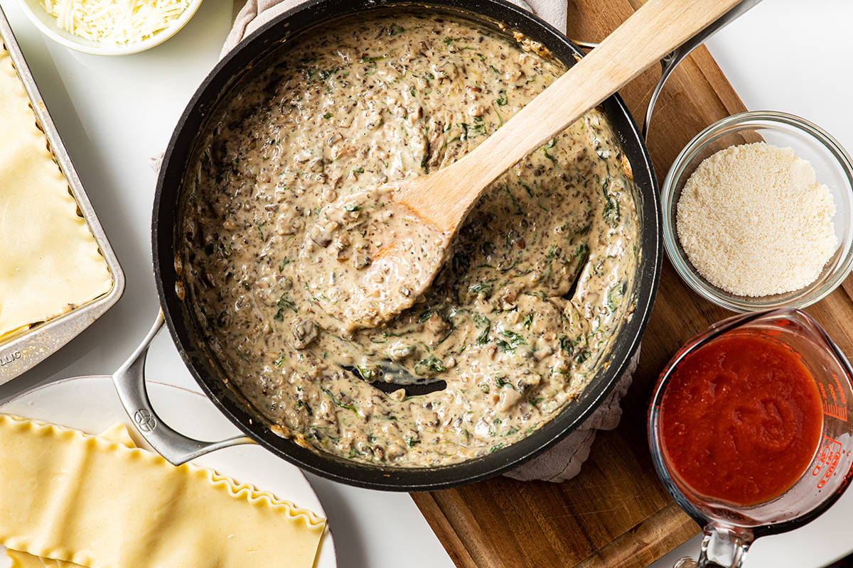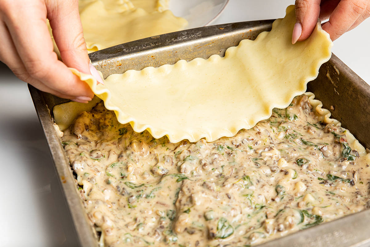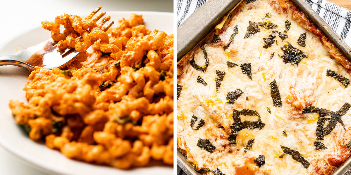 Taste your pasta! When it's chewy but still has a firmness in the center, it's ready. The texture changes very quickly, so drain your pasta immediately when you've reached your desired chew. A back-pocket trickOnce you've nailed your pasta cooking, here's a simple sauce recipe to always keep handy: romesco. Most of the ingredients you can keep in your pantry, so they'll be waiting for you on the night you're stuck late at the office or your flight is delayed and you don't make it home until 9 p.m., when you're beyond starving. Romesco is a Spanish invention, a vivid orange-y red sauce made of roasted peppers, tomato and almonds. While it's fully plant-based, the almonds provide a creaminess that gives the sauce a frothy body. There are endless romesco variations, but the general idea is the same: Pop the pepper, tomatoes, almonds, spices and olive oil into a blender and blend. Then behold, an instant, creamy, red sauce, and one that's more filling and protein-packed than marinara, thanks to the almonds. Layers of love On the other end of the pasta spectrum is lasagna: the entertaining home run. How do you achieve the ultimate layered pasta? Again, it starts with noodles that have just the right tender bite. A purist would make their own fresh lasagna noodles, of course. To make it prep-time friendlier, pick up regular lasagna noodles (avoid the "no boil" variety), then boil them to well under al dente, so they're almost crunchy. It may feel a little odd, but the noodles continue to cook throughout the bake time, leaving them al dente after the bake. After that, it's all about contrasts. This lasagna shows us that earthy mushrooms and rich cheese are tasty in their own right, but adding a fresh herb topping with zingy lemon zest amps them up exponentially. While it takes a bit of prep time to put together, nothing says love more than a lasagna. And that aroma after you pull it out of the oven will convince you it was all worth it … in a heartbeat.  | Recipes | Pasta Romesco With SpinachRomesco is a bright, rich Spanish sauce of almonds, red pepper and tomato. This version can be whipped up in five minutes. Throw in sauteed spinach, mix it with pasta and you've got dinner. Accessorize with a green salad. Want to add seafood? Cook a bit of shrimp separately, then add it with the pasta and romesco sauce. Make the romesco sauce and refrigerate for up to 2 days in advance. Refrigerate leftovers for up to 2 days; reheat in a skillet. Fusilli col buco are long, spiral-shaped noodles. They're harder to find, but extra festive for this recipe (we found ours online). Spaghetti and bucatini also work well. For easy printing and scaling, view this recipe at washingtonpost.com/recipes. Ingredients3 servings Prep time: 10 minutes. Cook time: 15 minutes. Kosher salt 8 ounces dried fusilli col buco (see headnote; may substitute spaghetti or bucatini) 3 tablespoons extra-virgin olive oil, plus more for serving 3 medium cloves garlic, minced 4 ounces (4 packed cups) baby spinach leaves 4 large roasted red peppers from a jar, drained and sliced (2 cups) 2/3 cup roasted unsalted almonds 2 tablespoons tomato paste 1 teaspoon Spanish smoked paprika (pimentón) Freshly ground black pepper 5 large leaves fresh basil, coarsely chopped StepsThis one is quick and simple. Bring a pot of generously salted water to a boil over medium-high heat. Add the pasta and cook according to the package instructions, until al dente (see above); drain. In a large skillet or saute pan over medium heat, heat 1 tablespoon of the oil until shimmering. Stir in the garlic and cook until fragrant, about 30 seconds, then add the spinach and a pinch of kosher salt. Cook, stirring until the spinach is wilted, about 3 minutes. Turn off the heat. Now for that quick romesco sauce. In a blender, combine the roasted red peppers, almonds, tomato paste, smoked paprika, the remaining 2 tablespoons of oil and 1/4 teaspoon of the salt. Puree to form a smooth, bright orange-red sauce. Add the drained pasta to the skillet with the spinach, pour in the romesco sauce and toss until well coated. Add the basil. Taste and season with additional salt and the black pepper, if desired. Divide the pasta among bowls and drizzle with oil. Serve right away. Nutritional facts (per serving): Calories: 630; Protein: 17 g; Carbohydrates: 80 g; Fat: 32 g; Saturated Fat: 3 g; Cholesterol: 0 mg; Sodium: 600 mg; Fiber: 9 g; Sugar: 10 g. Mushroom and Goat Cheese LasagnaThis pan has it all: rich, creamy goat cheese sauce, earthy mushrooms, and a zesty lemon and basil topping. It's showy and memorable, fitting for a weekend project or a dinner party. Or assemble it the night before and enjoy it for a weeknight dinner. You can prepare the pan of lasagna in advance, then refrigerate overnight before baking. Increase the bake time as needed to cook until it's warmed through and the cheese has melted. You will need a 9-inch square baking dish. Refrigerate leftovers for up to 2 days. Or to freeze leftovers, cut the lasagna into single servings and freeze each in separate freezer-safe containers or wrapped in plastic wrap. To reheat, defrost in the refrigerator, then place in a baking dish, cover with aluminum foil and reheat in a 400-degree oven for about 15 minutes, until warmed through. For easy printing and scaling, view this recipe at washingtonpost.com/recipes. Ingredients9 servings Prep time: 35 minutes. Cook time: 45 minutes, plus 15 minutes of resting time. 1 pound baby bella (cremini) mushrooms, stemmed and chopped 4 ounces (4 packed cups) baby spinach leaves 2 tablespoons extra-virgin olive oil 1 medium shallot, minced 2 medium garlic cloves, minced 2 tablespoons flour 2 cups low-fat milk (2 percent) 4 ounces fresh goat cheese, crumbled 1 tablespoon minced fresh thyme 1/2 teaspoon kosher salt, plus more as needed Freshly ground black pepper 9 dried lasagna noodles (about 8 ounces total; do not use "no-boil" noodles) One 15-ounce can crushed fire-roasted tomatoes (1 1/