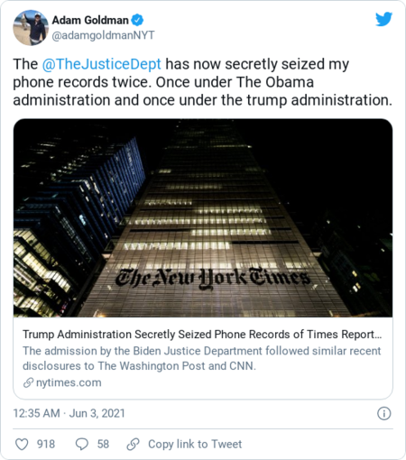 | | | The investigations ANOTHER TRUMP-ERA SEIZURE: "The Trump Justice Department secretly seized the phone records of four New York Times reporters spanning nearly four months in 2017 as part of a leak investigation, the Biden administration disclosed on Wednesday," the New York Times's Charlie Savage and Katie Benner report. - "It was the latest in a series of revelations about the Trump administration secretly obtaining reporters' communications records in an effort to uncover their sources. Last month, the Biden Justice Department disclosed Trump-era seizures of the phone logs of reporters who work for The Washington Post and the phone and email logs for a CNN reporter."