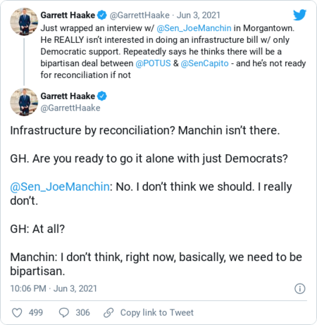 But how much compromise is too much? "As the negotiations drag on, both Biden and Senate Republicans are weighing how much they can compromise without angering members of their own party, and the reception to the latest proposals could determine whether any deal is possible," the Wall Street Journal's Kristina Peterson, Andrew Restuccia and Richard Rubin report. - Between a rock and a bipartisan place. "Biden is caught between progressive Democrats who have encouraged him to spend more and moderates who want him to find common ground with the GOP. Capito and her colleagues, meanwhile, want to avoid being accused by conservatives of capitulating to Biden and greenlighting too much new spending."