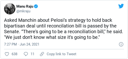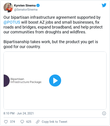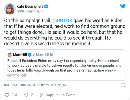 | Welcome to The Daily 202 newsletter! Tell your friends to sign up here. It's the birthday of the author we all know as George Orwell, and everyone should read his "Politics and the English Language." President Biden yesterday celebrated a bipartisan infrastructure deal in which "none of us got all that we wanted," then sold it to wary progressives by vowing to kill it if they don't get more of what they — and he — want in a companion bill. "If this is the only thing that comes to me, I'm not signing it," the president declared. "I'm not just signing the bipartisan bill and forgetting about the rest." Given the dense parliamentary thicket through which the two proposals must slog to reach Biden's desk, tweeted exuberance about the breakthrough could either be farsighted or end up as a minor digital display in the Museum of Disappointment. Still, the White House took an understandable digital victory lap, tying the accord to the president's career-long attraction to two-party transactions and his campaign-trail covenant to try to work with Republicans. The deal, according to Paige Winfield Cunningham, aims "to revitalize the nation's road and transit systems, while upgrading broadband and investing in other public-works projects." "The bipartisan agreement, crafted by Sens. Rob Portman (R-Ohio), Kyrsten Sinema (D-Ariz.) and eight others in the Senate, would spend $973 billion over five years (or $1.2 trillion over eight years). Of that, $579 billion is new spending that was not already allocated through other projects, according to details released by the White House. The new spending includes $312 billion for transportation projects, $55 billion for water infrastructure and $65 billion for broadband — figures hashed out by the five Democrats and five Republicans who had negotiated for weeks on the package." The bill focuses on physical infrastructure, not on items like care for children and the elderly or on affordable housing, and it omits major measures to combat the climate crisis, all of which were in Biden's original multi-trillion-dollar proposal. The White House and its allies must now win over skeptical liberals and conservatives to the spirit of bipartisan bonhomie — hardly a sure thing, and harder given skepticism from Senate Minority Leader Mitch McConnell (R-Ky.). As regards that self-indulgent "thicket" metaphor, the plan is to turn the deal into legislation, pass a budget resolution to set up a process called reconciliation that lets Democrats pass a broader package without GOP votes, and then send the two packages to Biden. No part of this is easy. McConnell accused Biden of "caving" to the left and criticized what he described as holding "hostage" the bipartisan deal to smooth the way for the "wasteful" bigger package, according to this Associated Press dispatch from Jonathan Lemire, Josh Boak, and Lisa Mascaro. But House Speaker Nancy Pelosi (D-Calif.) promised progressives early yesterday she won't bring the bipartisan plan to a vote until the Senate sends the House the reconciliation bill. "We will not take up a bill in the House until the Senate passes the bipartisan bill and a reconciliation bill," she told reporters. Biden cast the twin announcements — the bipartisan deal, coupled with what seems likely to be the Democrats-only companion — in the image of his governing philosophy: Work with Republicans when he can, go one-party when he must. "I know there are some of my party who discouraged me from seeking an agreement with our Republican colleagues, who said that we should, 'Go bigger and go alone," Biden said. "But let me say this: When we can find common ground, though, working across party lines, that is what I will seek to do," the president said. Some of the cheerful language after Biden announced the deal made it sound like the real infrastructure breakthrough was the friends senators made along the way — and across the aisle. Two of the winners — so far — seemed to be Democratic Sens. Joe Manchin III (W.Va.) and Sinema (Ariz.), who have been at the center of Beltway political journalism so much over the past few months they may deserve their own celebrity name mashup ("Manchinema"? "Sinemin"?) Over at Roll Call, Jessica Wehrman, Niels Lesniewski and Jennifer Shutt report: "Republican lawmakers said the Democratic plan, which aimed to give Biden a win on the bulk of his domestic priorities, was not necessarily a deterrent to voting for the bipartisan agreement. 'I'm going to make a decision based on what's on the floor,' said Sen. John Barrasso, R-Wyo., of the bipartisan plan. 'I want to make sure it's legitimate infrastructure, it's fully paid for and it doesn't touch the taxes.'" They also got this from Sen. Jon Tester (D-Mont.): " 'It's a huge investment,' he said. 'I think it's an incredibly positive thing. Is it going to be as much as some people want? No. Is it going to be more than other people wanted? Yes. But in the end I think it's gonna be really good for the country and it shows the world that we're not just, you know, a hot mess here.' " | | | What's happening now Derek Chauvin will be sentenced today for the murder of George Floyd. The former Minneapolis police officer faces up to 40 years in prison, Holly Bailey reports. "While Chauvin will almost certainly receive prison time for Floyd's killing — making him only the second police officer in Minnesota history to be jailed for an on-duty murder and one of less than a dozen officers nationwide — how much time he might serve has become a point of contention. An attorney for Chauvin, who has been held in solitary confinement at a state prison near the Twin Cities since his April 20 conviction, has argued that the ex-officer should get probation, while prosecutors are seeking at least 30 years." At least four people are dead after a condo partially collapsed in Surfside, Fla. The frantic search for survivors continues, Timothy Bella, Lateshia Beachum and Antonio Olivo report