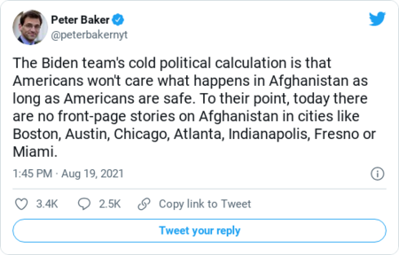 | Welcome to The Daily 202 newsletter! Tell your friends to sign up here. On this day in 1968, Moscow sent troops into Czechoslovakia to crush the "Prague Spring." Turn on CNN or any other cable TV news, and you're likely to see images of the chaotic evacuation of Afghanistan, or debates about how President Biden has handled (or mishandled) getting American civilians out of there. But head to local news, especially newspapers, and the landscape changes and changes dramatically. They're not ignoring the plight of the tens of thousands of U.S. citizens, or Afghan civilians entitled to apply for visas to come here. But it's rarely the top story. Instead, the biggest headlines belong to the pandemic. The coronavirus has killed more than 625,000 people in the United States. The delta variant over the past few months has sent cases soaring, driven thousands into hospitals and swollen the death toll. Americans are fighting in school board meetings and courts and legislatures and governors' offices and sometimes in the streets over what to do about it. It's a huge public-health story, an economics story, a science story, a national security story, a parenting story, a story about social mores, and, yes, a politics story. At the risk of being coarse, let's talk about that last bit. Whether this dynamic benefits President Biden isn't entirely clear. Here's an observation from my friend Peter Baker, who covers the White House for the New York Times: Would Biden rather talk about the pandemic, when polls show the public generally approves of his approach (though that number has slipped) and sides with him in some high-profile fights with Republicans? Cases, hospitalizations and deaths have risen, driven by the unvaccinated. Or would he rather talk about Afghanistan, given Americans have strongly supported withdrawing but the scenes of chaos in Kabul could come with a political price? One reason a phenomenon like the pandemic is a political nightmare for a White House is it's a deeply emotional national — okay, international — story easily told at the local level. No White House is perfectly equipped to keep track of, never mind push back against, every local TV affiliate or newspaper piece that raises hackles at 1600 Pennsylvania Ave. Here's a sampling of what Americans woke up to this morning, courtesy of the Newseum's "Today's Front Pages" website. The Miami Herald front page this morning has two foreign policy stories: One is about new sanctions on Cuban officials, another about the situation in Haiti in the aftermath of a major earthquake. There's no Afghanistan piece on the front page. The Atlanta Journal-Constitution's big headline is "Doctors plead with public to get shots." The front page also includes a piece on highway toll lanes, job growth, the death of a high school science teacher from the coronavirus. But all the way down on the front page is a "Protests erupt for 2nd day in Afghanistan" nugget that does not refer to Biden or the evacuation. The Boston Globe leads with a piece by its own Jess Bidgood: "Biden blamed for Afghan refugees' plight." But the splashiest front-page story is about Latino-driven population growth, and the coronavirus still gets more real estate than the evacuation. The Dallas Morning News has a photograph of Afghan protesters against the Taliban and a nod to a new poll showing roughly two-thirds of Americans say the war wasn't worth fighting. But most of the front page is how schools are responding to the coronavirus, vaccines, deleted police files, border spending, and Republican election legislation. "Afghans keep up protests against Taliban" greets you at the Los Angeles Times, which also has a large "reporter's essay" entitled "Surreal brush with militants. Journalists are roughed up, then offered an energy drink." Mask-wearing and actress Scarlett Johansson's lawsuit against Walt Disney are there too. The Arizona Republic has a big piece on the Arizona Coyotes hockey team, an article about the 2020 election "audit," a tax hike for education — but also a small nod to a smiling boy getting evacuated from Kabul. The Arkansas Democrat-Gazette has not one but two Afghanistan headlines, one about the frenetic efforts to evacuate Americans, another entitled "Afghan fight not longer rational, Biden says." But coronavirus sits at the top of the front page. In my home state of Vermont, Afghanistan doesn't appear on the front page of the Burlington Free Press, which splashes a search for a new police chief in the Green Mountain State's largest city, and efforts to help LGBTQ teens. You get the point. In some ways, "you care about things most of the public doesn't care about" is as much a journalism business model as a critique. Most Americans don't toss and turn at night wondering about points of congressional procedure, or constitutional fights over war powers, or French foreign policy, or, at least based on newspaper front pages this morning, about what might happen to the estimated 10,000-15,000 Americans thought to be in Afghanistan when Kabul fell to the Taliban. Until they do, and then our experts and obsessives get to shine. It's just worth considering what Americans are seeing from their local news media, which polls show enjoys greater trust than national outlets. | | | What's happening now Biden will address the situation in Afghanistan at 1 p.m. Eastern. Tune in to our live coverage here. The Texas Supreme Court rejected Gov. Greg Abbott's (R) ban on school mask mandates — for now. "The court, whose justices are elected and currently all Republicans, cited a provision of the Texas Rules of Appellate Procedure for why the request was denied. The one-sentence order provided no additional details," Meryl Kornfield and Timothy Bella report. To start your day with a full political briefing, sign up for our Power Up newsletter. | | | More on Afghanistan Biden will speak about the ongoing military evacuations amid chaos at Kabul's international airport. -