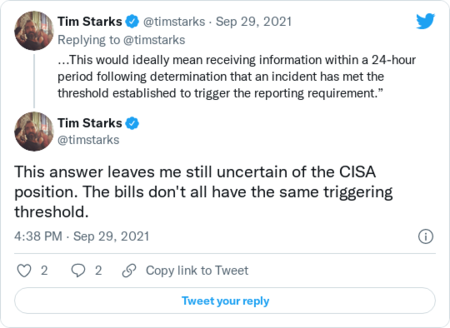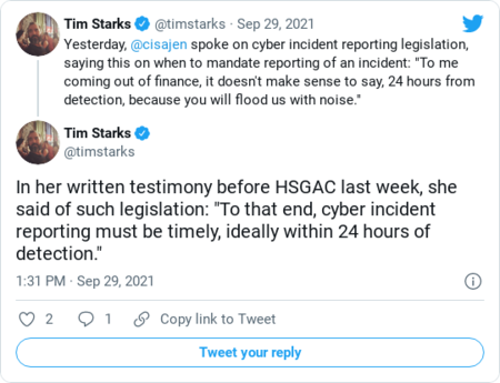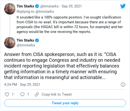 | | |  | Chat room | | | Does CISA want a new cyber incident reporting bill to require companies to alert about hacks within 24 hours? It's not clear. CyberScoop's Tim Starks has the details: | | |  | Cyber insecurity | | | |  | Daybook | | - Cybersecurity officials speak on the last day of the four-day International Wireless Communications Expo today.