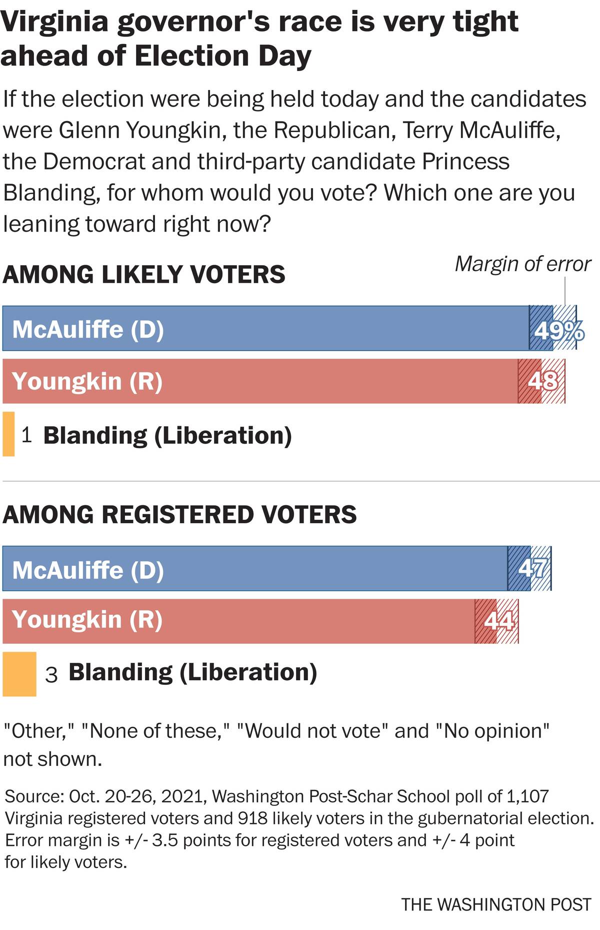 | Welcome to The Daily 202! Tell your friends to sign up here. On this day in 1800, President John Adams moved into the White House, becoming the first president to reside there. He lost the election that year to Thomas Jefferson. | | |  | The big idea | | Democrats fret about an enthusiasm gap in Virginia's gubernatorial contest | (Washington Post illustration; Anna Moneymaker and Win McNamee/Getty Images) | | | Read the past four months or so of news about the Virginia gubernatorial race — the one pitting Democratic former governor Terry McAuliffe against Republican Glenn Youngkin in a war for suburban swing voters — and you'll find a consistent thread: Democrats are worried about an enthusiasm deficit heading into 2022. The race is too close to call. It's not particularly helpful to McAuliffe that President Biden left for Europe last week with the fate of his infrastructure bill and sweeping social spending package in doubt. Lockstep GOP opposition to the second proposal has left Democrats laboring to paper over intraparty cracks on a range of issues to deliver something, anything, to increasingly skeptical voters. But win or lose on Tuesday, Democrats will be assessing what worked, what didn't and what it means for the party's tooth-and-nail efforts to buck historical trends and cling to narrow majorities in Congress in next year's midterm elections. | | Democrats have tried everything in Virginia (or maybe it just feels that way). | | They brought in the heavy hitters, as political scientists Christopher Stout, Karina Mondragon, and Cara Nixon analyzed in these pages one week ago. "President Biden, former president Barack Obama, House Speaker Nancy Pelosi (Calif.), first lady Jill Biden, Atlanta Mayor Keisha Lance Bottoms and former Georgia gubernatorial candidate Stacey Abrams will all have appeared with McAuliffe before Election Day." (The visitors' goal was less to swing Youngkin voters to the McAuliffe camp than to change minds from maybe-staying-home to cast-one-for-the Dem and "to attract support from and mobilize African American voters — a key voting bloc in a state that's becoming more racially and ethnically diverse.) Democrats have seized any opportunity to tie Youngkin to former president Donald Trump, who lost Virginia to Biden by 10 points in 2020. Over at CNN, Dan Merica and Eric Bradner reported over the weekend how "Trump has looked to inject himself into the race, releasing a series of statements on the contest over the last few months and, most notably, calling in to a rally where he lauded Youngkin and said the candidate would 'do all of the things we want a governor to do.' John Fredericks, a Virginia-based conservative radio host who served as the chair of the Trump campaign in the commonwealth, told CNN on Friday that the former president also plans to headline a tele-rally in support of the GOP ticket on Monday, the night before Election Day." And then there were the fundraising emails from McAuliffe's camp. "I am stunned more people aren't worried." "We must put a stake in the heart of Trumpism on Tuesday." "Where's the enthusiasm, Olivier?" "If our voters turn out, we win. If they don't, we lose." It's not at all clear whether Democrats' strategy is a winner, however, given Trump is out of the White House and off the ballot. (Democrats also face historical head winds: Over the past two decades or so, the party that holds the White House has tended to lose the Virginia governorship.) | | Virginia isn't the first major electoral test of the Biden presidency — that was the recall targeting Gov. Gavin Newsom (D-Calif.), who ultimately beat back his opponents in a landslide. And it's not the only race on Democrats' mind this week: Gov. Phil Murphy (D-N.J.) is looking to hold on to his job. But Democrats have long hoped to lock Virginia down as a blue state, powered by the kind of suburban voters who gave Biden the White House. My colleague Cleve R. Wootson, Jr., took a searching look at the race in today's Washington Post and found "Biden's sinking popularity has emerged as a key factor dragging down Democrats' hopes of victory — and making the state look, once again, more like a battleground than a Democratic stronghold." | | "Interviews with nearly two dozen voters in this vote-rich region in southeast Virginia about three hours' drive from Washington found a profound sense of frustration that people haven't seen benefits of Democratic control trickle into their lives or their wallets." "Particularly troubling, some said, is that nearly a year after a coronavirus vaccine was approved, mitigation efforts and covid restrictions remain a part of everyday life, the economy doesn't seem to be working for the most vulnerable and intraparty infighting has stalled progress promised by Biden and the Democrats." "The waning support for Biden has not meant a wholesale defection to the Republicans — and the potential passage of massive infrastructure and economic measures in the coming days, including programs like universal prekindergarten, could help Democrats regain their footing." A Washington Post-Schar School poll conducted last week is packed with bleak news for Democrats. Likely voters in the state disapprove of Biden's job performance 53 percent to 46 percent, with twice as many in the "strongly disapprove" camp (44 percent) as on the side of "strongly approve (21 percent). | Education as a pivotal issue? | | Republicans in Virginia have been road testing a "school board" strategy that taps into simmering parental anger after a year and a half of mixed pandemic messaging about when and how schools can open and operate, as well as rules about vaccinating children. (The campaign frequently includes falsehoods or misleading claims.) The Post-Schar School poll found 24 percent of likely voters said education was their top issue, compared to just 15 percent saying the same one month ago. Democrats haven't had much of an answer on that specific issue. Tuesd