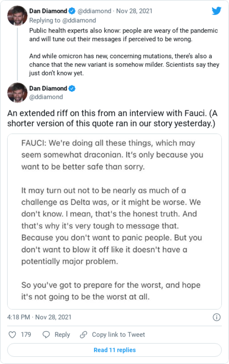 | | It'll take about two weeks to get more definitive information. That's what Fauci told Biden yesterday, according to a readout from the White House. 3. Vaccines can be altered to protect against the new variant — if necessary. | | Biden officials believe existing vaccines are likely to provide a degree of protection against omicron. The administration and some public health experts are focusing on booster shots as the best strategy to protect the country against the variant, The Post's Yasmeen Abutaleb, Fenit Nirappil, Rachel Pannett and your host report. Officials plan to urge Americans to get the third shot and sharpen efforts to ensure the boosters are available in as many locations as possible. It'll take time to learn whether the variant limits the effectiveness of the vaccines, but researchers could have a rough indication in about a week, Hotez said. | - Meanwhile, drugmakers say they're already preparing to make new versions of their vaccines to fight omicron if need be. Those could be created within just a few months, with Pfizer estimating 100 days to develop and produce the shot, our Post colleagues report, and Moderna saying it's beginning work on an omicron-specific booster shot that could begin clinical testing by early next year.