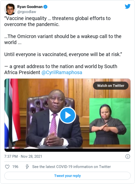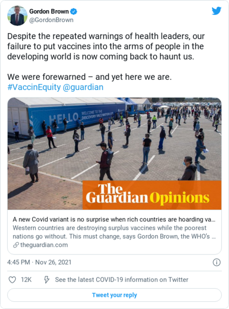 A couple walks past a billboard promoting vaccination in Harare, Zimbabwe, on Nov. 28. Zimbabwe faces travel restrictions due to the new coronavirus variant Omicron. (Aaron Ufumeli/EPA-EFE/REX/Shutterstock) | Omicron — the coronavirus variant with worrying mutations that was first detected in largely unvaccinated southern Africa — has made its way to the vaccine dose-rich West. Amid a global panic and fresh travel bans, confirmed cases have popped up from Britain to Australia. If omicron now rips through Western capitals as badly or worse than the delta variant before it, wealthy nations, scientists say, will be reaping what they sowed. Perhaps no other moment in the pandemic has lent more truth to the often ignored mantra that "no one is safe until we are all safe." Variants, experts say, are one deadly side effect of vaccine inequality — and a global system that has allowed wealthy nations, and large developing ones, to corral jabs for themselves, leaving poorer and less powerful countries to subsist on vaccine crumbs. Low vaccination rates have also made those nations potential breeding grounds for viral mutations that can then quickly spread in a globalized world. Full vaccination rates in the United States, France and China stand at 60 percent, 70 percent and 77 percent, respectively. Compare that to only 6 percent for Africa's 1.2 billion people. "Our achievements in our own country are at high risk because of the failures outside of our country, because of vaccine nationalism, not just in the United States and Europe, but also India and China," J. Stephen Morrison, director of the global health policy center at the Center for Strategic and International Studies, told me over the weekend. "If you have uncontrolled transmission in large populations, that is the optimum environment for generating new variants. In Africa, you have a 6 percent vaccination rate. You're going to get mutations." Early indications suggest omicron may spread with relative ease, but it's too early to tell how virulent it may be. Over the weekend, African leaders forcefully pushed back against the flurry of economy-crimping travel bans imposed by a host of nations including the United States, arguing they had no basis in science and were unjustly punishing nations with low access to vaccines. Experts told my colleagues that the travel bans being imposed now may already be too late. "The prohibition of travel is not informed by science, nor will it be effective in preventing the spread of this variant," South Africa President Cyril Ramaphosa said in a televised address. "The only thing the prohibition on travel will do is to further damage the economies of the affected countries and undermine their ability to respond to, and recover from, the pandemic." The rising alarm over omicron, however, is raising the prospect of a significant new global threat that could have been avoided. "Despite the repeated warnings of health leaders, our failure to put vaccines into the arms of people in the developing world is now coming back to haunt us," Gordon Brown, the former British prime minister and an ambassador with the World Health Organization, wrote in the Guardian. The answer, experts say, lies in more radical solutions than rich and powerful nations appear able or willing to agree on. Wafaa El-Sadr, director of ICAP, a global health center at Columbia University, is calling for a two-tiered approach. First, "wealthy countries, including the US, must provide resources to companies that produce vaccines now to increase vaccine production," she wrote to me this weekend. "What we are doing [so far] is donating the excess supply we have, essentially what we can spare." "For a longer term strategy, suspending intellectual [property rights] and investing in regional vaccine production capacity is critical," she wrote. Those types of bold solutions, however, face major obstacles at a time when developing nations are still far behind the West on vaccines. The World Health Organization-backed program to share vaccine doses around the world — known as Covax — had initially pledged to distribute 2 billion doses by year's end, reducing that target to 1.425 billion in September. As we lurch into December, only about 537 million have shipped. The reasons are myriad. As Vidya Krishnan wrote in Foreign Policy, India — intended to be Covax's primary supplier — stopped exporting vaccines in March to focus "instead on protecting its own population" amid a devastating coronavirus surge. Some exports restarted this month. At the same time, pledges from rich countries haven't come through fast enough. Some that did shipped too close to their expiration dates for use. Perhaps the biggest problem: Rich nations are still outcompeting poorer ones, giving booster shots widely and vaccines to children before the most vulnerable groups in many African countries have received their first doses. "Countries with the highest vaccine coverage continue to stockpile more vaccines, while low-income countries continue to wait," WHO Director General Tedros Adhanom Ghebreyesus said this month. "Every day, there are six times more boosters administered globally than primary doses in low-income countries. This is a scandal that must stop now." Some good news: A fast ramp up of doses to the developing world is set for the coming weeks and months, and in some countries, has already started. Last month, Covax shipped 111 million doses, more than in any other month this year. An extra 900 million doses are expected to be in the "pipeline" by December, the Wall Street Journal reported. But that expansion faces major hurdles to translate rapidly into shots in arms. Some vaccine makers are still not giving Covax enough notice on how many doses will be available and when. Some developing nations are also still not prepared for an onslaught of doses, needing more assistance for cold storage, distribution and heath-care staffing. Fueled by public skeptic