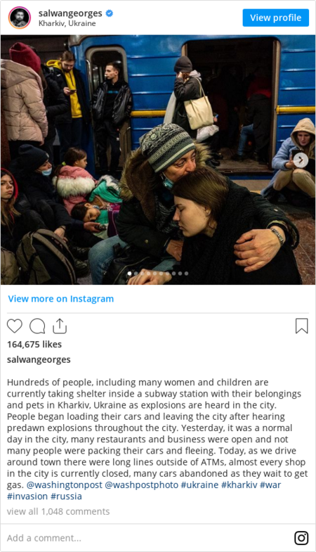 Photo of the week (Heidi Levine for The Washington Post) | After Russian troops launched their attack on Ukraine this week, tens of thousands of Ukrainians began to flee the country as their lives were suddenly upended by missiles and shelling. Across the nation, long lines built up at ATMs, gas stations and grocery stores, traffic jammed the streets and people were seen carrying suitcases as they waited at bus stations to leave. Above, Diana Kostro,18, and Nikolay Sychygov embrace on Thursday as they wait for a bus to escape Kyiv for Poland. Post photographers are capturing the scene across Ukraine and you can find their latest work here. |