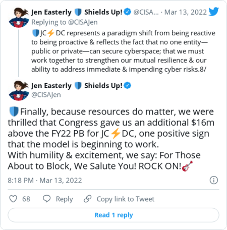 | | CISA Director Jen Easterly also highlighted funding for the Joint Cyber Defense Collaborative, CISA's public-private collaboration program: | | |  | Industry report | | | SocialProof Security chief executive Rachel Tobac hacked former DreamWorks Animation chief executive Jeffrey Katzenberg (with his consent) in this slick video developed for a South by Southwest conference panel. The hacking demo was organized by the online identity protection company Aura. Aura CEO Hari Ravichandran also appeared with Tobac and Katzenberg on the panel. Katzenberg is an Aura investor. Watch the hack here: | | |  | National security watch | | | |  | Global cyberspace | | | |  | Cyber insecurity | | | |  | Daybook | | - Senate Intelligence Committee Chairman Mark R. Warner (D-Va.) and Chris Painter, the Obama administration's top cyber diplomat, discuss cybersecurity and Russia's invasion of Ukraine at an event hosted by the Center for Strategic and International Studies on Monday at 11 a.m.