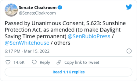 | | |  | The Media | | | |  | Viral | | | Hello, sunshine, my old friend: "The Senate voted Tuesday to end the biannual practice of 'spring forward' and 'fall back' under a bill that would make daylight saving time permanent — a move that reflects the increasingly popular view that the twice-yearly disruption hurts sleep and poses health and safety risks," our colleague Dan Diamond reports. | - Be careful what you wish for? "As most of us bemoan our messed-up sleep schedules on the first Monday after losing an hour, it's worth a little history lesson: We've tried this before, and it didn't go over well," our colleague Aaron Blake writes. "Whatever momentary mental anguish you're experiencing right now, there are huge trade-offs that many or most Americans have previously decided aren't worth the switch."