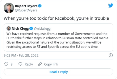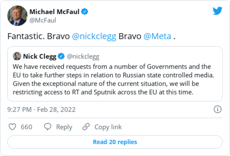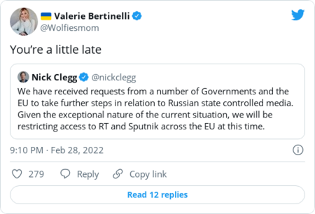 | | Those moves came just one day after European Commission President Ursula von der Leyen said the E.U. was banning RT and Sputnik so they would "no longer be able to spread their lies to justify Putin's war and to sow division in our union," Elizabeth Dwoskin and Cat Zakrzewski report. Twitter didn't respond to their requests for comment on whether they would also ban the outlets in Europe. Meanwhile, governments and regulators continue to scrutinize the outlets. U.K. broadcast regulator Ofcom has opened 15 investigations into its Ukraine coverage, the Guardian's Jim Waterson reports. "British broadcasting rules allow politically biased coverage providing the output still meets the standards of 'due impartiality' — meaning viewers are still exposed to alternative viewpoints," Waterson writes. The regulator could force RT's U.K. television channel to go off the air. | Netflix won't comply with Russian rule forcing it to broadcast pro-Kremlin stations | The regulations tell Netflix to add 20 Russian television channels to its streaming service in the country. (Jenny Kane/AP) | | | Netflix doesn't plan to leave Russia, where it is trying to expand its foothold, the Wall Street Journal's Joe Flint reports. The regulation requiring Netflix to add streams of 20 Russian stations was set to go into effect today, Politico Europe previously reported. The rule applies to streaming services with at least 100,000 daily users, the Moscow Times reported. "Given the current situation, we have no plans to add these channels to our service," a Netflix spokesman told the Journal. Russia's communications regulator ordered the company to add channels including the Russian Orthodox Church's Spas channel and the Kremlin-linked Channel One. | | |  | Rant and rave | | | Facebook's decision to block RT and Sputnik in the European Union was met with applause, criticism and commentary. Former U.S. ambassador to Russia Michael McFaul: | | Actress and author Valerie Bertinelli: | | Barrister and writer Rupert Myers: | | |  | Inside the industry | | | |  | Privacy monitor | | | |  | Mentions | | - Christine Bannan has joined ProtonMail, where she will lead U.S. public policy efforts. Bannan previously worked as policy counsel at New America's Open Technology Institute.
