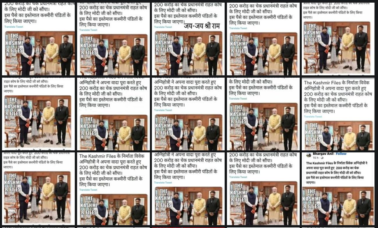 A photo of 'The Kashmir Files' director Vivek Agnihotri with Prime Minister Modi is viral as part of an infographic that reads, "The KASHMIR FILES donated the entire fund of 200 crores to the Prime Minister's Fund. Salute to Vivek Agnihotri for donating the entire collection of 'The Kashmir Files' to the Prime Minister's Relief Fund." It is important to note that the film has earned approximately ₹250 crores at the box office.