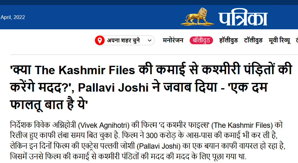 We came across a report by Patrika published earlier this year discussing an interview of Vivek Agnihotri and Pallavi Joshi. According to the report, Agnihotri was asked a question about whether he will be donating the film's earnings. Joshi called the question absurd and said that there are four producers of the film and they are the ones who earn money and further invest it in future projects.