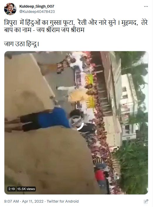 Abhishek Kumar posted: "A video that shows anti-Muslim slogans being raised during a rally is viral on social media. It is being shared with the following caption in Hindi, "Hindu anger erupts in Tripura". त्रिपुरा में हिंदुओं का गुस्सा फूटा, रैली और नारे सुने । मुहमद, तेरे ब"