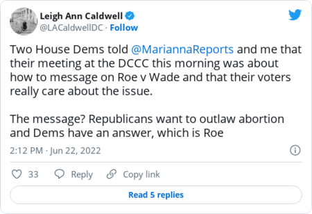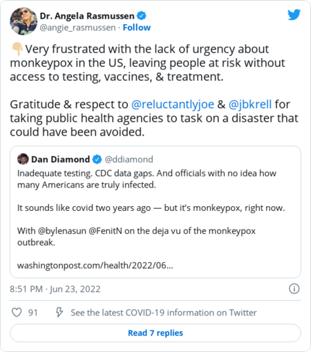 | | On Wednesday, House Democrats met at the Democratic Congressional Campaign Committee (DCCC) headquarters near the Capitol. Their briefing consisted of DCCC staff and officials from major abortion rights groups, including NARAL Pro-Choice America, Emily's List and Planned Parenthood. This was the message, per a House Democratic strategist: "House Democrats are going to make it clear to voters that we're fighting to protect women's long-held right to make decisions about their own bodies. Republicans are hellbent on ripping power away from women and their doctors." | | Leigh Ann Caldwell, co-author of The Early 202: | | | | | | Meanwhile, Democratic senators are pressing the Biden administration on administrative actions they believe are in its purview, such increasing access to abortion through medication abortion and by using federal property. But still, there's little the White House can do to fundamentally change a post-Roe world, my colleagues Yasmeen Abutaleb and Tyler Pager reported last month. That means the Democratic fight for abortion rights will turn to the states. In recognition of the battles likely to come, Vice President Harris convened a meeting with Democratic attorneys general yesterday. If Roe is overturned … the Democratic Attorneys General Association is planning to have AGs out on television shortly after a ruling, an effort to highlight the enormous power attorneys general wield over the rules in their state. Some Democratic AGs in Republican-led states have already said they don't plan to enforce abortion bans if the Supreme Court overturns the landmark 1973 ruling. | | |  | Public health | | Monkeypox response in U.S. mirrors early coronavirus missteps, experts say | Officials from the within the Biden administration are among public health experts worried that the White House could be bungling its monkeypox response. (Oliver Contreras/The Washington Post) | | | Public health experts, including within the Biden administration, are increasingly concerned that the federal government's handling of the largest-ever U.S. monkeypox outbreak is mirroring its cumbersome response during the early days of the coronavirus pandemic, The Post's Lena H. Sun, Dan Diamond and Fenit Nirappil write. They're warning that community transmission is occurring largely undetected, and the critical window to contain the outbreak is closing quickly. The Centers for Disease Control and Prevention has confirmed more than 170 monkeypox cases across the United States, but that number is likely much higher. Critics say the government has moved slowly to expand testing, vaccinate people at highest risk and clearly communicate the symptoms associated with monkeypox — a disease spread by close contact that has left gay and bisexual men who are disproportionately contracting the virus especially vulnerable. The defense: Administration officials insist their response reflects lessons learned from fighting the coronavirus, like waiting to distribute the "right test that works" to laboratories after federal officials distributed flawed coronavirus tests in early 2020. | | Angela Rasmussen, virologist: | | | | | | |  | Chart check | | | Monkeypox has spread quickly across the United States, mirroring trends around the globe. | | | |  | From our reporters' notebooks | | | The Post's Dan Diamond sends us this dispatch: Greetings to Health 202 readers from Aspen Ideas Health, the festival hosted in a picturesque Colorado town that is now crawling with health care luminaries. As a result, there are a lot of "health officials, they're just like us" moments; on a typical afternoon, one can see former Clinton Health and Human Services Secretary Donna Shalala hunting for a FedEx box, or former Trump HHS Secretary Alex Azar taking in an interview between CDC Director Rochelle Walensky and CBS News' Jon LaPook. (Walensky got a standing ovation at the end of the friendly interview; your author is not sure if Azar joined in.) Your correspondent caught up on several sessions, which are also being live-streamed. Former Surgeon General Jerome Adams called for teaching medical professionals to talk about safe storage of firearms. Mount Sinai Health System rehab expert David Putrino (one of the few people to be masked at the festival) shared how long covid symptoms can range from totally debilitating to more of a frustration. And CNBC's Bertha Coombs quizzed CMS Administrator Chiquita Brooks-LaSure about what it really means to build "health equity" into the federal government's health-care programs. On tap today for this Post reporter: conducting an on-stage interview with former White House covid coordinator Deborah Birx, as well as a session on combatting health care misinformation. If you have questions for Birx, or tips for moderating a live panel after some covid-induced rustiness, he'd welcome all thoughts at dan.diamond@washpost.com. | | |  | Agency alert | | Biden administration backs Colorado's public option plan | Colorado Gov. Jared Polis (D) on Wednesday signed the "Colorado Option" bill into law. (David Zalubowski/AP) | | | Colorado became the first state yesterday to receive a green light from the Biden administration to create its own public health insurance option to be sold alongside commercial coverage on the Affordable Care Act's marketplace. The "Colorado Option" is expected to expand coverage to nearly 10,000 residents. More than a decade ago, a federal public option was in the running to be included in the ACA, but was nixed in the final version. While President Biden campaigned on creating a government-run health insurance program, the prospects of fulfilling his pledge at the federal level have since faded — leaving states to test out the concept on their own. Other states, like Washington and Nevada, have also passed public options, but Colorado is the first state to receive a waiver from the Centers for Medicare and Medicaid Services. | FDA orders Juul e-cigarettes off the U.S. mark