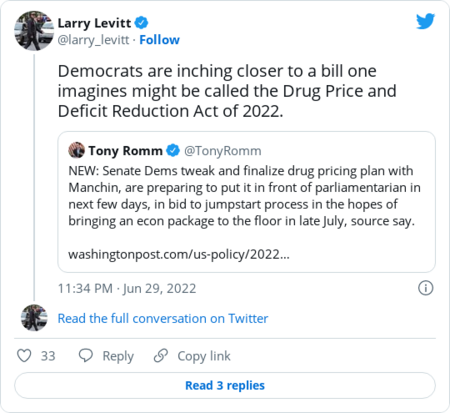 | | Several Democrat-led states have passed legislation this year to counteract laws that try to restrict movement across state lines. The Justice Department has signaled its intention to fight against these kinds of laws in court. But like the Texas abortion ban, the proposal itself could have a chilling effect, where doctors in surrounding states stop performing abortions before courts weigh in out of worry they may face legal repercussions. | | |  | On the Hill | | Democrats forge ahead on drug pricing | Democratic leaders are working to strike a deal with Sen. Joe Manchin (D-W.Va.) on an economic spending package to deliver on their campaign promises. (Oliver Contreras for The Washington Post) | | | Democratic leaders have finalized a revised proposal to lower prescription drug prices for seniors, part of a broader scramble to satisfy Sen. Joe Manchin (D-W.Va.) and resurrect a long-stalled economic package that they hope to advance as soon as this summer, The Post's Tony Romm reports. The development follows weeks of talks between Senate Majority Leader Chuck Schumer (D-N.Y.) and Manchin, a centrist holdout whose spending concerns scuttled Democrats' previous economic package, called the Build Back Better Act. The retooled prescription drug pricing proposal is largely similar to last year's bicameral compromise. Party leaders hope to include the drug pricing plan as part of a revived economic package that they would advance through the narrowly divided Senate through reconciliation. The retooled drug pricing proposal would: | - Allow the federal government to negotiate the price of select drugs on behalf of Medicare beneficiaries to lower health-care costs. Those talks would begin in 2023.