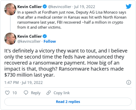 | | The conclusion: The Justice Department needs to write a new cyber hiring and retention strategy, and "the Department should initiate an internal campaign to educate managers and budgetary personnel regarding existing hiring and retention incentives," according to the report. | | |  | The keys | | Justice Department seizes $500,000 from North Korean ransomware gang | A North Korean ransomware gang has been targeting health-care systems, authorities previously said. (Kim Won Jin/AFP/Getty Images) | | | The Justice Department said Tuesday it snatched approximately $500 million back from a suspected North Korean government-affiliated ransomware gang known as Maui, after a Kansas medical center reported to the DOJ that the hackers encrypted systems used to operate key equipment and paid the gang to unlock them. | | In prepared remarks, Monaco told cybersecurity conference-goers in New York City that the Kansas center — which she didn't name — "did the right thing" to cooperate with the FBI, which in turn was able to identify the ransomware and trace the center's $100,000 bitcoin payment to money launderers based in China. That put the FBI on the trail of a Colorado medical facility's payment to the Maui attackers, too, enabling the bureau to recover around $500,000 in all. The Justice Department flex comes shortly after government and cyberfirm warnings about the rising Maui ransomware threat to the health-care sector. | - The FBI, the Treasury Department and the Department of Homeland Security's Cybersecurity and Infrastructure Security Agency issued an alert July 6, saying it had responded to multiple Maui attacks that encrypted systems crucial to health-care services. "In some cases, these incidents disrupted the services provided by the targeted [health-care] organizations for prolonged periods," the alert said.