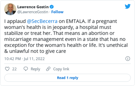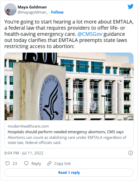 | | Maya Goldman, Modern Healthcare: | | | | | | The guidance centers on the Emergency Medical Treatment and Active Labor Act, known as EMTALA. Enacted in 1986, the law requires that anyone coming into an emergency department be stabilized and treated, regardless of their ability to pay for care. | | All abortion bans currently in effect permit providers to terminate a pregnancy to protect the life of the mother. Yet they can be vague, leaving doctors to navigate a complex environment of what constitutes a life-threatening condition. The vast majority of abortions are elective, rather than due to an emergency medical condition. Yet some providers have feared they may be forced to choose between breaking their doctors' oath and breaking the law, our colleague Ariana Eunjung Cha recently reported. | - "With the change in the law, people providing certain services have raised questions to the authorities inside the hospital — the legal authorities — just to make sure what their direction should be," said Chip Kahn, president of the Federation of American Hospitals, which represents for-profit hospitals.