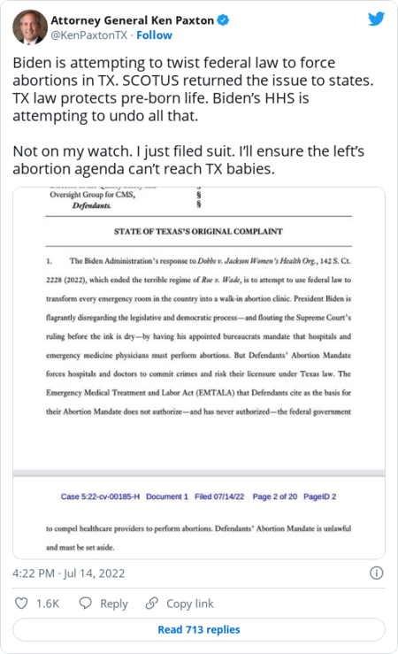 | | |  | On the Hill | | House Democrats tee up votes on abortion rights | Women's Health Protection Act sponsor Rep. Judy Chu (D-Calif.) said the vote will send a message to Americans that Democrats support abortion rights. (Jabin Botsford/The Washington Post) | | | House lawmakers today are expected to pass a bill that would codify the right to an abortion less than a month after the Supreme Court overturned Roe v. Wade. The largely symbolic vote comes as Democrats move to signal their commitment to abortion rights following the court's ruling. The Women's Health Protection Act, an updated version of a bill the House passed in September, would also prohibit states from imposing restrictions that would make abortions more difficult to obtain. It is almost certain to die in the Senate, where it would need the support of 10 Republicans to pass or all Democrats on board with scrapping the filibuster. "There is tremendous fear and anxiety," Rep. Judy Chu (D-Calif.), the bill's sponsor, told The Health 202. "And not a lot of people remember that we passed this bill in September, so we felt it was really important to put the bill on the floor." The chamber is slated to vote on another piece of legislation to protect patients' right to travel to receive an abortion if their state bans the procedure and shield the people who help them to do so from legal ramifications. Republicans in the Senate yesterday stymied Democrats' attempt to pass similar legislation through unanimous consent. As of now, no states have moved to penalize providers or others for performing abortions on women coming in from out of state, though some major groups are actively working on legislation to do so. | | Sen. Ron Wyden (D-Ore.): | | | | | | Our colleague Caroline Kitchener broke down those plans: | | | | | | |  | Reproductive wars | | Texas sues Biden administration over rule requiring abortions in medical emergencies | Texas Attorney General Ken Paxton (R) sued the Biden administration to block new guidance on emergency medical services for pregnant people. (Emil Lippe/The Washington Post) | | | Texas Attorney General Ken Paxton (R) asked a federal court yesterday to block new guidance from the Biden administration reminding doctors that they must terminate a pregnancy if doing so is necessary to stabilize a patient in an emergency medical situation, The Post's Katie Shepherd reports. The lawsuit comes just days after the Department of Health and Human Services sent a memo to hospitals asserting that federal law requiring emergency medical treatment preempts any conflicting state restrictions. The agency warned physicians and hospitals that refusing to treat women who need an abortion could result in fines or being booted from the Medicare program. The lawsuit challenges the administration guideline on the grounds that it uses federal funds — since it ties compliance to Medicare and because funding for the Justice Department would go toward enforcing the law — in violation of the Hyde Amendment, which bars federal spending to facilitate an abortion except in most cases. | | Texas Attorney General Ken Paxton (R): | | | | | | The Indiana doctor who provided abortion services to a 10-year-old Ohio girl who was raped disclosed the procedure to state authorities, according to documents obtained by the IndyStar through a public records request. The Post also obtained the records. The latest news follows comments made by the state's Republican Attorney General, Todd Rokita, this week, who said his office would investigate whether Caitlin Bernard, an Indianapolis-based OB/GYN who performed the procedure, reported the minor's sexual abuse and abortion as required by Indiana law. Despite the newly disclosed forms, Rokita said he plans to continue with his investigation, IndyStar's Tony Cook reports. | | Caitlin Bernard, Indiana physician at the center of the case: | | | | | | |  | State scan | | A post-Roe surge could reshape this Illinois steel mill town | | In a post-Roe world, the conservative leaning community of Granite City in southern Illinois offers the closest abortion services for many patients across the South and Midwest. It's a shift that has the potential to reshape the steel mill town, but not everyone's happy about it, our colleague Caroline Kitchener reports. As many as 14,000 women are expected to travel to the region for abortions this year, mostly from neighboring states where the procedure is largely restricted. And while the area leans conservative, abortion rights in the state are largely protected by Illinois' blue government. Read Caroline's full dispatch here. | | |  | In other health news | | - Nearly 20 senators yesterday sent a letter to President Biden and Becerra pressing the White House to declare national and public health emergencies over abortion access.