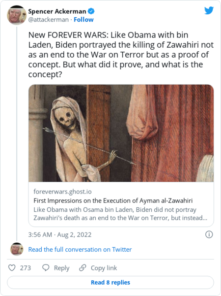 Ayman al-Zawahiri in a still image taken from a video released on Sept. 12, 2011. (Site Monitoring Service/Reuters TV) | When the United States killed Osama bin Laden in 2011, the act brought about a moment of national catharsis. Nearly a decade after carrying out the deadliest single attack on U.S. soil, al-Qaeda's leader had been apprehended in his Pakistani hideaway and slain. It was an ignominious end for a militant commander whose shadow had loomed over the world and whose actions ushered in a new geopolitical era — the age of the U.S.-declared "war on terror." Once news broke of bin Laden's death, Americans celebrated on the streets of major cities. In baseball stadiums and college campuses, large crowds chanted "U-S-A!" The photograph of President Barack Obama, surrounded by his closest advisers as they watched the Navy SEAL mission go into motion, quickly went viral. It was hailed a "photo for the ages," an iconic image of American triumph. President Biden, then Obama's vice president, was present in that picture. So, too, was current Secretary of State Antony Blinken. And for all the exultation they may have felt 11 years ago, they were unlikely to feel the same this weekend, in the aftermath of the CIA drone strike that killed Ayman al-Zawahiri, bin Laden's former deputy. Zawahiri was, after all, standing on the balcony of a safe house in an upscale neighborhood in Kabul, the Afghan capital which U.S. forces had chaotically vacated last year in a humiliation that will haunt Biden's legacy for years to come. The victorious Taliban had provided assurances that their days of abetting al-Qaeda terrorists were over, but those commitments were never worth taking at face value and were made all the more suspect by the factionalism and divisions among the Islamist militants. In remarks announcing Zawahiri's death, Biden cited the United States' ongoing prosecution of its war against Islamist terror groups. "The United States continues to demonstrate its resolve and capacity to defend Americans from those who seek to do it harm," Biden said, making it "clear again [that] no matter how long it takes, no matter how you hide … the United States will find you and seek you out." Analysts see in the strike that took out Zawahiri a clear demonstration of the "over the horizon" capability that Biden touted when justifying his decision to hasten the U.S. military withdrawal from Afghanistan last year. Boots on the ground matter less when you can rain Hellfire missiles down on your enemies from drones. The strike was "a major counterterrorism achievement — and a much-needed triumph for the Biden administration, for whom anything to do with Afghanistan has become an issue of acute discomfort," noted the Middle East Institute's Charles Lister. But it's worth asking what it achieved. Zawahiri, 71, was a diminished figure — influential, no doubt, but far removed from the days when he plotted terrorist attacks that led to thousands of American and non-American deaths. Al-Qaeda itself is a shadow of its former self and now faces a potential succession crisis. Its militant threat remains, diffused and scattered across the world through a range of splinter groups. "Lacking bin Laden's loyal following, Zawahiri tried to command far-flung terrorist groups that often ignored his decrees and rejected his advice," my colleagues wrote. "In particular, he was overshadowed by the rise of the Islamic State and its bloody dominion for several years over parts of Syria and Iraq." The U.S. operation to kill Zawahiri can't only be seen as evidence of successful pinpoint counterterrorism tactics, but a reminder of the far broader and more complicated legacy of the war on terror. Al-Qaeda is "weaker than it was on Friday, but parsing what exactly that means is academic," wrote Spencer Ackerman, author "Reign of Terror: How the 9/11 Era Destabilized America and Produced Trump," on Monday. "Far more substantial is the reality that the apparatus of the War on Terror, with the exception of the Afghanistan War, the original CIA torture program and Section 215 of the PATRIOT Act, remains in place." U.S. troops remain on the ground in a host of Middle Eastern and African countries. U.S. drone strikes continue across a wide swath of the planet, from West Africa to South Asia. Airwars, a watchdog group, estimates that U.S. drone and airstrikes have killed some 22,000 to 48,000 civilians since Sept. 11, 2001 — a figure exponentially larger than that of the U.S. citizens slain by bin Laden and Zawahiri's violent plots. And the legacy of the U.S. role in Afghanistan — two decades worth of spilled blood and treasure, only for the Taliban to surge back to power — clouds all other assessments. "I don't know how to weigh the balance and come up with a final reckoning, but I know that this revenge is sour," wrote George Packer in the Atlantic, analyzing the killing of Zawahiri. "It's particularly sour when you think about the circumstances of Zawahiri's death." The United States could only locate and take out Zawahiri because he was ensconced in an Afghan capital that the United States and its allies had effectively ceded to the Taliban. The pathos and irony of it all are hard to ignore. "Losing the war made it easier to kill Ayman al-Zawahiri," Ackerman wrote. What it means going forward is equally bleak. The Taliban, knee-deep in a humanitarian emergency both of their own and the Biden administration's making, denounced the strike as an infringement of Afghan sovereignty. They may be compelled to take a more antagonistic stance. "The Taliban are in deep political trouble now, and they are going to face pressure to retaliate. The relationship they have with al-Qaeda and other jihadi groups remains very strong," Asfandyar Mir, an expert on Islamic extremism at the U.S. Institute of Peace in Washington, told my colleague Pamela Constable. "I think we should brace for impact." For ordinary Afghans, reeling amid the economic