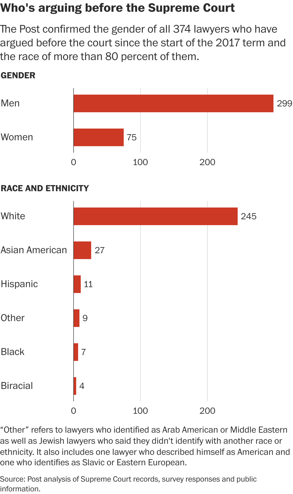 | Good afternoon, Early readers. Happy Sunday and welcome to a special edition of The Early 202. Well, maybe we should've called today's newsletter "The Late 202." Tips: earlytips@washpost.com. | | |  | From the courts | | The Supreme Court is more diverse than ever. The lawyers who argue before it are still mostly White men. | (Washington Post illustration) | | | The Supreme Court's approach to issues involving race will be in the headlines once again on Monday when the justices hear two cases involving affirmative action, months after President Biden fulfilled his pledge to diversify the court by nominating the first Black woman justice. Justice Ketanji Brown Jackson's addition to the court means it's now more diverse along racial and gender lines than ever before. But the elite group of lawyers who argue before the justices remains mostly White and male. Black and Hispanic attorneys remain dramatically underrepresented among Supreme Court litigators, according to an analysis done by The Early 202 of lawyers who've delivered oral arguments in recent years. Women are also significantly underrepresented. And there are particularly few women of color. As the court grapples with the affirmative action cases and others involving race, the paucity of Black and Hispanic lawyers arguing before the court spotlights how people of color are often excluded from the rooms in which decisions that affect them are made. | | Vanessa Malone on how few fellow Black women have argued before the Supreme Court. | "What are we doing here? Our benches are diversified, but the people who are coming before the benches are not." | | | | | | | Since the start of the Supreme Court's 2017 term, 374 lawyers have argued before the justices. Some have argued more than a dozen times. To determine the demographics of this group, The Early 202 asked each of them to share their race or ethnicity, gender and other information about their backgrounds. More than 290 responded. The Post confirmed the race of seven more lawyers based on articles, speeches and interviews in which they described how they identify. The Post also confirmed lawyers' gender based on their biographies on law firm and other professional websites and how the justices referred to them during oral arguments. In total, The Post ascertained the gender of all 374 lawyers who have argued before the high court since the start of the 2017 term and the race of more than 80 percent of them. What we found: | - Nearly 81 percent of the lawyers whose race we confirmed are White, and 62 percent are White men.