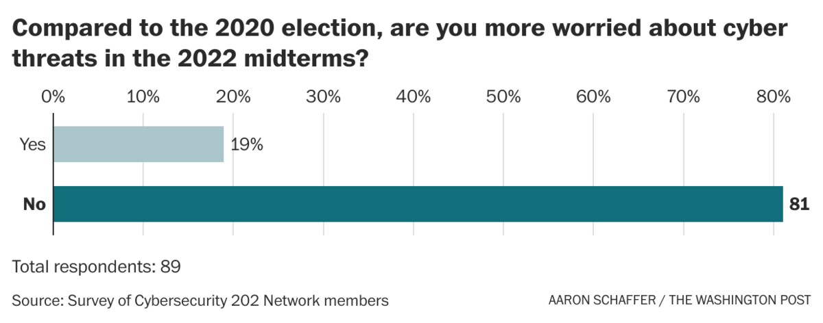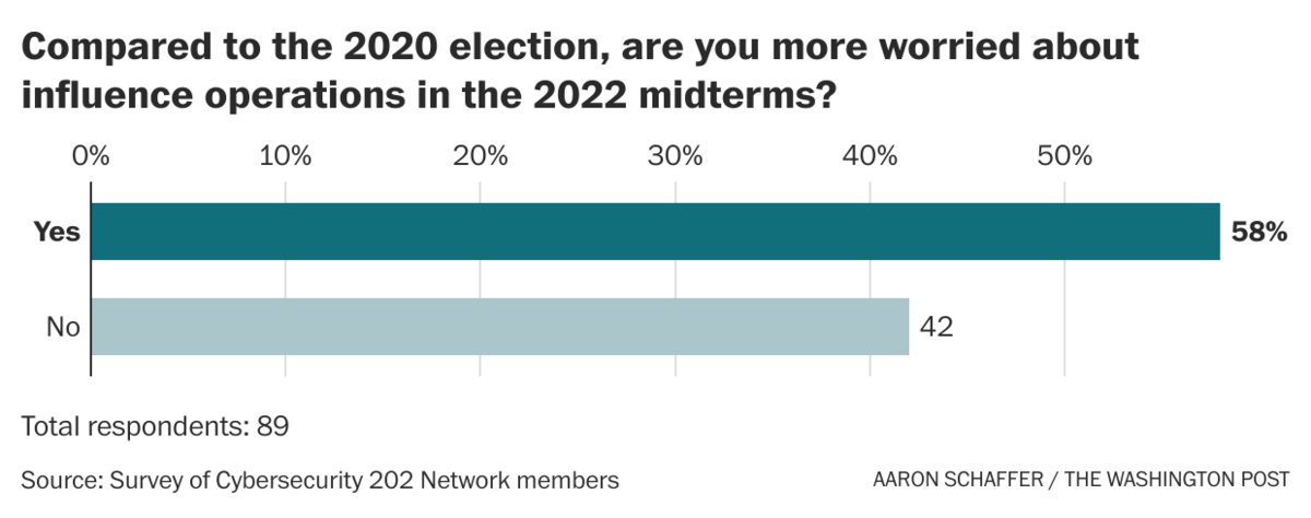 | | In some cases, experts saw an overlap between foreign influence campaigns and domestic ones. "We are in a hybrid war with Russia and they've co-opted many more useful idiots to undermine the integrity of the 2022 election than in 2020," said Chris Finan, president and chief operating officer of ActZero. A handful of experts pointed to Republicans explicitly. | | Foreign adversaries "are interested in a U.S. foreign policy that is more chaotic and incoherent, which is more likely with a Republican-controlled Congress," said Herb Lin, a cyber expert at Stanford University. "Influence operations require less technical skill than cyber operations and hence are easier to conduct; hence my greater concern about influence operations." | Not more worried about both | | The midterms are simply of lesser importance to foreign adversaries than years marked by a presidential race, said a number of experts who were not more worried about both threats in 2022. "I remain worried about cyberthreats and influence operations in every election," said Betsy Cooper, director of the Aspen Institute's Tech Policy Hub. "This being said, foreign nation states are more interested in presidential elections than midterms, so I would expect them to have dedicated more resources in 2020 than they will in 2022." Several respondents explained that they were equally worried about one threat or the other, compared to 2020 — thus, not technically "more" worried. Just as some experts gave federal and election officials credit for better protecting election infrastructure, Dave Aitel, a partner at Cordyceps Systems, said "it's worth giving the social media company some credit for establishing internal monitoring of influence operations and acting to shut them down." | | There's little reason to think the United States is sufficiently more prepared now than in 2020, said some who were more concerned about both cyberthreats and influence operations in the midterms. "Influence operations and election hacking are as old as elections," said Tor Ekeland, managing partner for Tor Ekeland Law. "Human psychology hasn't changed, but the technological tools to manipulate and hack have — to a point where their detrimental effect[s] are much harder to mitigate. It will get worse before it gets better, if ever." The learning experience of attackers figures into that too, said Steve Grobman, McAfee's chief technology officer. "Cyberattacks become more lethal by learning from the successes and failures of previous attacks," he said, while emphasizing the high demand for cyber pros and unfilled jobs. "Election influence campaigns follow this same pattern. For example, adversaries can exploit previously identified weaknesses that have not been remediated, such as the failure to move all election domains to .gov." | | A couple experts called attention to other side-effect threats, like Rep. Jim Langevin (D-R.I.), who was more worried about disinformation and less worried about cyberthreats. "It's also vital to recognize how disinformation raises the threat of electorally motivated violence, including against poll workers and other election administrators, who play such a critical role in the functioning of our free and fair elections," Langevin said. "That, to me, is a much more likely and more concerning threat to our democratic process." Megan Stifel, who said she was less worried about both threats in 2022, was also concerned about some additional issues. "I do worry about the direction of our elections in general as the number of experienced elections administrators is shrinking and the roles are being filled by inexperienced political puppets who give longevity to disproven theories and failed attempts to undermine the 2020 elections and are working to undermine best practices that create opportunities for manipulation," said Stifel, chief strategy officer for the Institute for Security and Technology. | | |  | The network | | - Elizabeth Wharton, vice president for operations at SCYTHE, is more worried about both: "The threat is now coming from inside the house and they now have the script. Domestic actors saw the success of foreign influence campaigns in 2020 and thanks to the extensive 2020 election reporting, they now have the 'how to' playbooks."