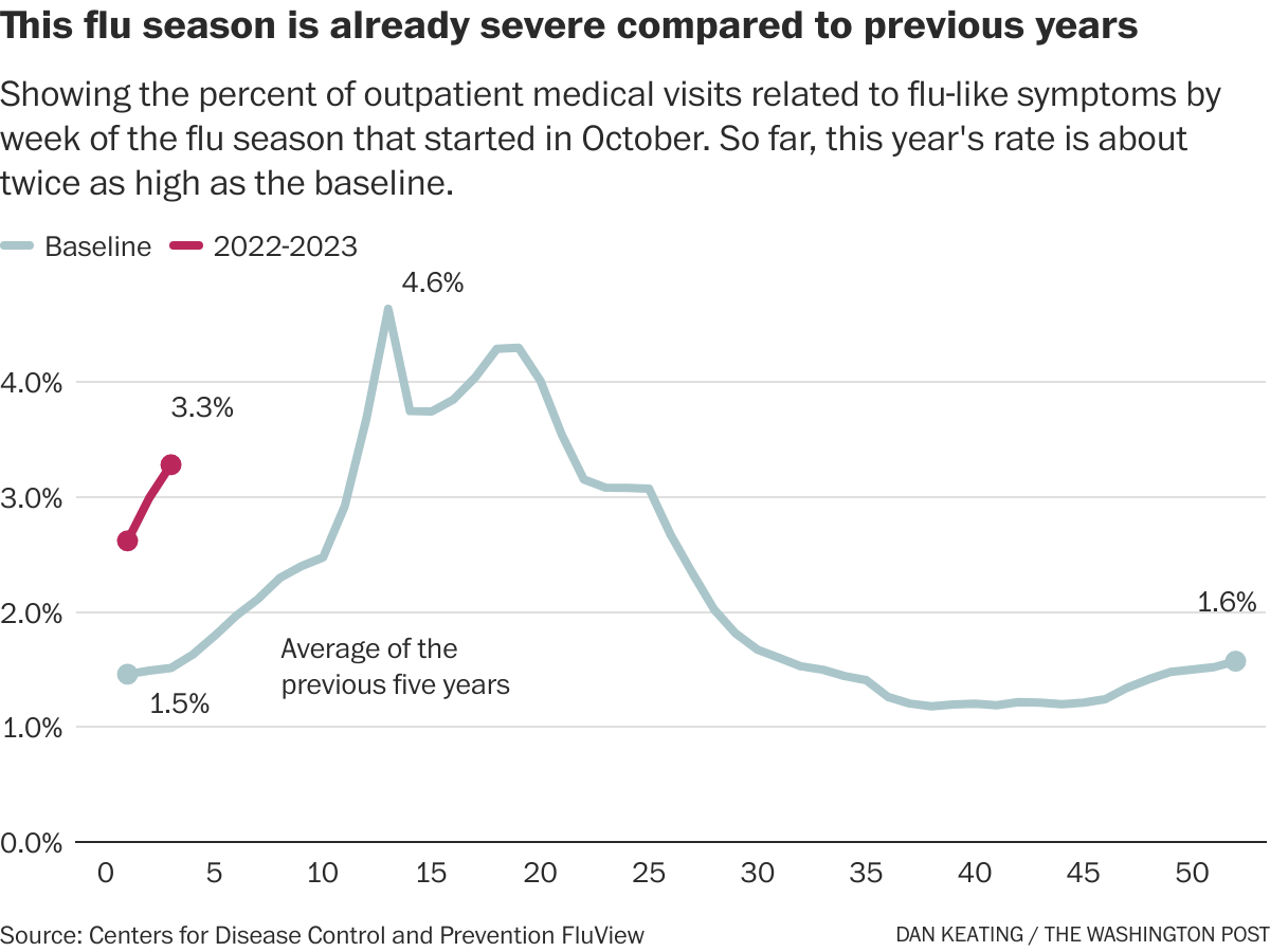 | | Republican Gov. Brian Kemp avoided pledging that he wouldn't sign future abortion restrictions in last night's gubernatorial debate with Stacey Abrams, a Democrat. Kemp said "it's not my desire to go move the needle any further," according to the Associated Press, though acknowledged a Republican legislature could pass further restrictions. "We'll look at those when the time comes," he said. He criticized Abrams as inconsistent on the limits on the procedure she would support. She contended her position has remained the same, and she'd support legal abortion until fetal viability, which is typically viewed as about 22 to 24 weeks. | | |  | Flu season | | The flu has arrived early, and it's more severe than it's been in 13 years | Experts are warning about lagging vaccination rates amid an early start to flu season. (Bloomberg News) | | | Influenza is hitting the United States unusually early and hard this year, resulting in the most hospitalizations at this point in the season in more than a decade, our colleague Lena H. Sun writes. The details: Flu season, which usually starts in October and peaks between December and January, arrived about six weeks early with uncharacteristically high illness. Until now, activity has been high in the U.S. south and southeast, but the flu is starting to pick up steam along the Atlantic coast. So far this season, there have been an estimated 880,000 illnesses, 6,900 hospitalizations and 360 flu-related deaths nationally, including one child, according to data the Centers for Disease Control and Prevention released Friday. For context, the burden of the flu hasn't been this high this early since the 2009 H1N1 swine flu pandemic. Experts are raising alarms about lagging flu vaccination rates. Just 128 million doses of flu vaccine have been distributed so far, compared with 139 million at this point last year and 154 million the year before, according to the CDC. | | |  | Chart check | | | |  | In other health news | | - Some researchers are attempting to find ways to blunt the coronavirus' slippery evolution. Their mission? Determine how to block the human proteins it uses against us, The Post's Mark Johnson reports this morning.