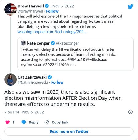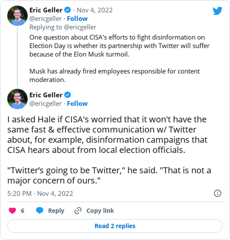 | Welcome to The Cybersecurity 202! After watching a bunch of spooky movies and shows for Halloween, I needed some comedy to cleanse the palate. I can heartily recommend "Everything Everywhere All at Once," which somehow exceeded my high expectations, as well as "Weird: The Al Yankovic Story," which got a laugh every few seconds or so. Below: NSO is reportedly in bad financial straits, and a Greek newspaper says nearly three dozen people were targeted with spyware. First: | The government says it won't flag election disinformation on Twitter and other social platforms | Elon Musk has made massive layoffs at Twitter . (Jonathan Newton/The Washington Post) | | | The Cybersecurity and Infrastructure Security Agency says it's taking a hands-off approach when it comes to false claims about the election process on Twitter. CISA spokesperson Michael Feldman told me the agency isn't flagging any election-related disinformation to Twitter or any social media platform. His comments come after an Intercept report last week detailed communications between the government and tech companies, prompting criticism from conservatives and raising concerns among some civil rights advocates. Instead, Feldman said, state and local officials can flag potential disinformation about their elections to the Center for Internet Security (CIS), a nonprofit which may then pass it on to social media platforms "who, as always, make their own decisions according to their own policies," he wrote in an email. With one day to go until the midterm elections, concerns about election disinformation on social media have proliferated, exacerbated by Elon Musk's purchase of Twitter and subsequent widespread staff layoffs. This election will be the first nationwide test of the democratic process after the 2020 election in which former president Donald Trump falsely claimed — and convinced many of his supporters — that it was stolen from him. Yet even before Musk's takeover, Twitter and other social media platforms were already leaving false election claims alone, as my colleagues Naomi Nix, Jeremy Merrill and Hayden Godfrey reported. And the Election Integrity Partnership found in a report over the weekend that many of 2020's top "voter fraud influencers" remained active on social media, with some further expanding their reach across platforms. | | Musk laid off an estimated half the company on Friday, with teams devoted to content moderation taking part of the hit. "The layoffs included a number of people who were scheduled to be on call this weekend and early next week to monitor for signs of foreign disinformation, spam and other problematic content around the election, one former employee told The Washington Post," as my colleagues Drew Harwell, Cat Zakrzewski and Isaac Stanley-Becker reported. | - What's more: "A representative from one of the national party committees said they are seeing hours-long delays in responses from their contacts at Twitter, raising fears of the toll workplace chaos and sudden terminations is taking on the platform's ability to quickly react to developments."