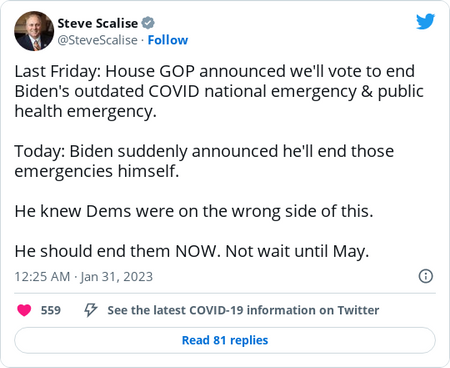 | Good morning ☀️ The Post wants to hear from you. Have you struggled to get insurance to pay for high-priced drugs? Fill out our questionnaire to tell your story (and we won't publish your responses without following up). Today's edition: The federal health department is seeking to recoup $4.7 billion from Medicare Advantage plans. The Republican National Committee is urging the GOP to "go on offense" on abortion in 2024. But first … | It will soon be time to unwind pandemic-era flexibilities | President Biden removes his face mask as he arrives to speak in the South Court Auditorium on the White House campus in October 2021. (Drew Angerer/Getty Images) | | | President Biden will end the national emergencies to combat the coronavirus on May 11, setting off a massive bureaucratic effort to halt critical tools the country has used to fight the pandemic for roughly three years. The administration announced its decision as it denounced House Republican efforts to vote on bills this week to end the emergency declarations immediately. The White House argued that doing so would "create wide-ranging chaos and uncertainty" throughout the health-care system and disrupt the orderly wind-down the administration had envisioned. Since Biden entered office, his administration has pledged to give governors 60 days' notice before terminating the public health emergency, as health groups fretted about an abrupt termination. An end to the public health emergency appeared likely to come this spring — unless there was a major change in the pandemic's trajectory — but the notice yesterday afternoon in response to two Republican bills came unexpectedly. The looming expiration of the orders signifies a new phase of the pandemic response, as U.S. officials get rid of flexibilities used during the earliest and darkest days of the coronavirus, our colleagues Tyler Pager and Lena H. Sun note. | | House Republicans had already planned votes this week on four bills aimed at moving the country past the pandemic. The party immediately took a victory lap after the White House said the covid-19 emergencies would end in a few months, claiming the administration had caved to pressure from the party. | | Specifically, lawmakers are slated to vote on legislation today to immediately end the public health emergency (PHE) declaration for covid-19, which the nation's top federal health official has renewed every 90 days since January 2020. And as soon as Wednesday, the House is expected to vote on a resolution to terminate a separate covid-19 national emergency first declared in March 2020. In a notice to Congress, the White House announced its opposition to House Republicans' approach and said it would briefly extend both declarations before officially terminating them on May 11. In a sign of the fights to come … The White House said ending the emergencies would also terminate Title 42, a pandemic-era policy allowing the quick expulsion of migrants from the U.S. borders for public health reasons, Tyler and Lena write. Because Title 42 is a public health order, the Centers for Disease Control and Prevention determined there would no longer be a need for the measure once the coronavirus no longer presents a public health emergency, according to an administration official. But some House Republicans pushed back. They argued that Title 42 is not tied to the public health emergency and is at the president's discretion. Rep. Brett Guthrie (R-Ky.), who authored the bill to end the PHE, told The Health 202 that his bill "doesn't touch anything on Title 42." | | House Majority Leader Steve Scalise (R-La.): | | | | | | Unwinding pandemic-era flexibilities isn't an easy task. Some of them have become so ingrained in the health system that lawmakers extended the benefits, such as keeping critical Medicare telehealth policies through 2024. And Congress recently told states they can begin to kick people off Medicaid who are no longer eligible starting April 1 — a rule that was originally tied to the end of the PHE. But the emergency status came with an array of powers that would still be impacted, such as granting flexibility for health providers in a number of areas, including hospital bed capacity and billing procedures — and medical systems will need to make adjustments, Tyler and Lena note. One of the biggest concerns to Jen Kates, a senior vice president at the Kaiser Family Foundation, is access to critical pandemic tools for those without health coverage could go away. | - "To me, that's the biggest issue for the general public to think about," she told The Post. "The uninsured and underinsured have no guaranteed access to covid vaccines, tests or treatments."