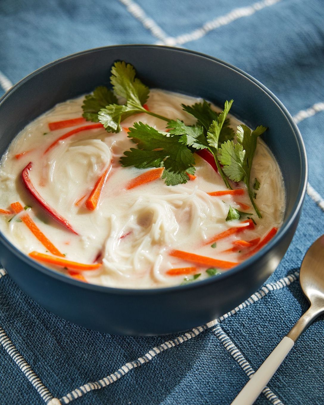 Steps1. Pour the broth into a deep saucepan over medium-high heat. Add the garlic, ginger and chile pepper; once the liquid comes to a boil, reduce the heat to medium-low and cook until the ginger softens a bit, about 5 minutes 2. Stir in the coconut milk and rice noodles; cook, stirring occasionally, until the noodles are tender, about 3 minutes 3. Increase the heat to medium-high. Stir in the carrots and cook for no more than 2 minutes; they should retain a little crunch. Add the chopped cilantro, lime juice, soy sauce and toasted sesame oil. Remove from the heat. 4. Divide among bowls, then garnish with the whole cilantro leaves. Adapted from "Fresh: Simple, Delicious Recipes to Make You Feel Energized," by Donal Skehan (Sterling Epicure, 2017). Tested by Bonnie S. Benwick. Nutrition information per serving (using low-fat coconut milk): Calories: 310; Total Fat: 7 g; Saturated Fat: 5 g; Cholesterol: 0 mg; Sodium: 380 mg; Carbohydrates: 57 g; Dietary Fiber: 2 g; Sugar: 3 g; Protein: 5 g.