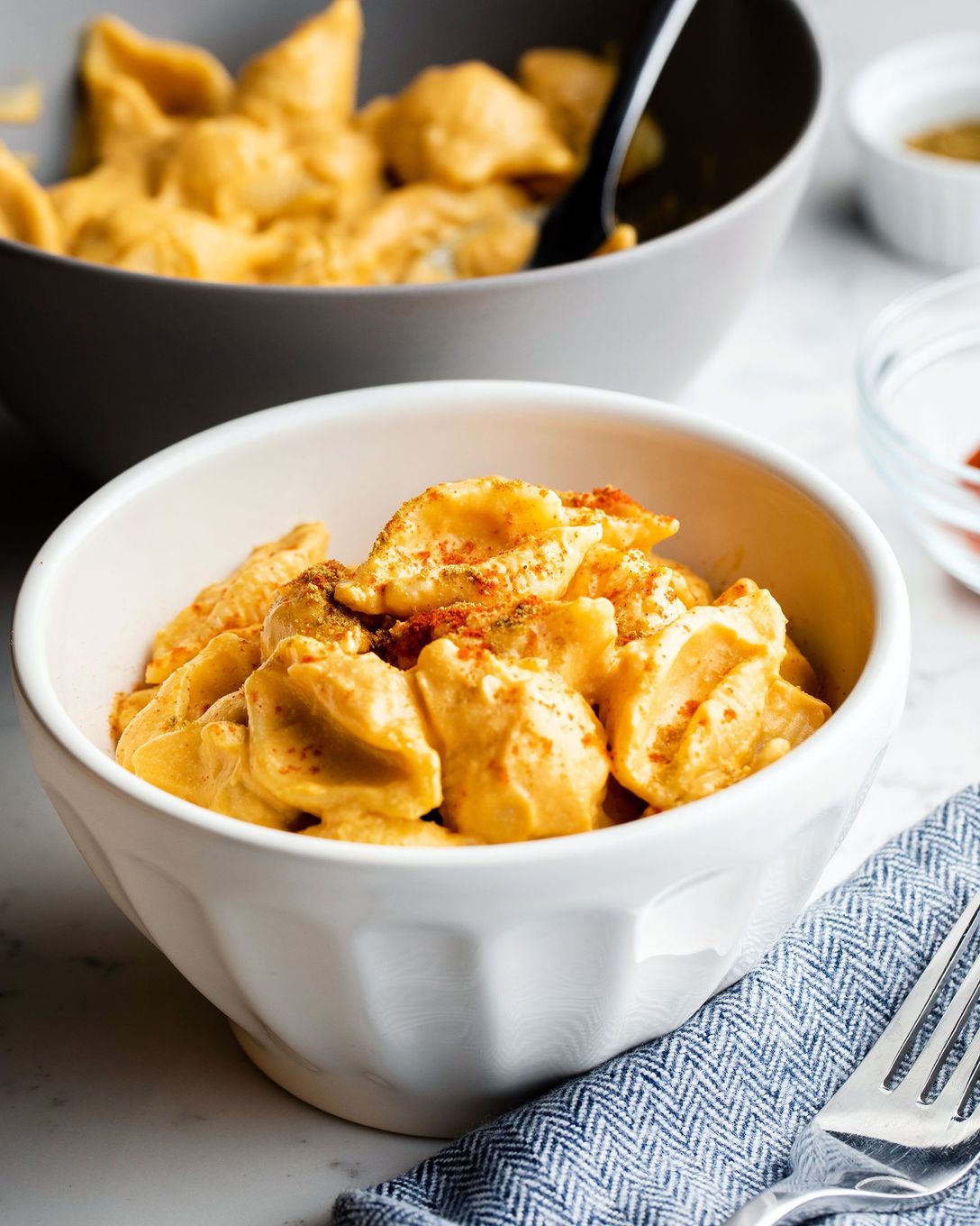 - Butternut squash ensures a deep orange color and gives the sauce some body.