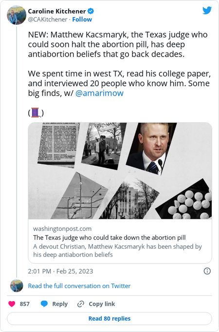| | But again, there are caveats. "That's going to be dependent on how the judge rules," said Kirsten Moore, the director of the advocacy organization Expanding Medication Abortion Access Project, adding the plaintiffs also mention misoprostol. Another option is ramping up surgical abortions — something providers have already done in the wake of the ruling overturning Roe. Many providers likely won't have the capacity to increase such services much more than they already have. | In other medication abortion news … | | The Post's Caroline Kitchener and Ann E. Marimow had a deep dive out this weekend into Matthew Kacsmaryk, the Texas judge nominated by former president Donald Trump who could take down the abortion pill mifepristone. What emerged from their reporting was a portrait of a religious conservative who is widely regarded as a thorough and analytical legal thinker, but who also comes to his judicial work with a long history of activism rooted in his religious beliefs. A quick snapshot: When he was 22 years old, he spent a day with his teenage sister's baby before the infant was given up for adoption. Kacsmaryk's sister, Jennifer Griffith, says that helped solidify his belief that every pregnancy should be treasured. In college, he wrote a letter to the editor of the student newspaper on abortion, and he has previously shared with friends that he thinks the Supreme Court's Roe decision was an overreach. Read the full story here. | | ๐งต A thread from Caroline: | | | | | | Twelve Democratic state attorneys general sued the FDA in an attempt to loosen restrictions on the distribution of mifepristone, arguing the agency has imposed "particularly burdensome" limitations on the drug, The Post's Kelsey Ables reports. In a statement to The Health 202, the agency said it doesn't comment on litigation. | | |  | Industry Rx | | Doctors who touted ivermectin for covid-19 are now pushing it for flu, RSV | Pierre Kory, a Wisconsin critical care doctor, co-founded the Front Line Covid-19 Critical Care Alliance. (Tom Williams/Getty Images) | | | The Front Line Covid-19 Critical Care Alliance first championed ivermectin as a coronavirus treatment. It didn't live up to the hype, and prescriptions for the drug nosedived. | | Now, the group that was formed in 2020 is promoting the anti-parasitic to prevent and treat the flu and RSV, The Post's Lauren Weber reports. There isn't clinical data in humans to support using ivermectin for either one, according to the Centers for Disease Control and Prevention and other medical experts, which strongly advise against such protocols. "And yet, the alliance publishes 'treatment protocols' promoting the use of ivermectin for flu, RSV and covid that it says have been downloaded more than a million times," Lauren writes. "It also recommends a network of hundreds of medical providers and pharmacies that can provide prescriptions for ivermectin, often through virtual visits that can run hundreds of dollars." The view from the alliance: One of the alliance's co-founders, Pierre Kory, a Wisconsin critical care doctor, responded through a spokesman to questions about the group's recommendations despite the lack of scientific evidence and accusations of profiteering from medical misinformation. | - "He said doctors and medical scientists associated with the alliance began exploring how 'covid-like' respiratory infections 'might respond to novel treatments' and developed the protocol for RSV and flu 'using medical and scientific research (including over 80 references to peer reviewed studies) as well as clinical data from doctors currently treating patients,'" Lauren writes.