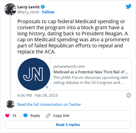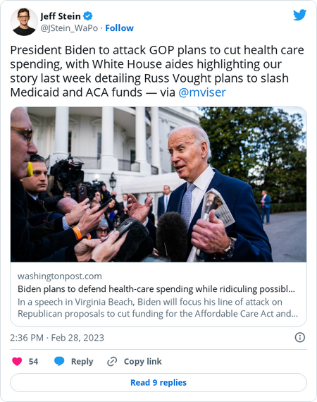 | Good morning! Do you and your significant other order the same dish at a restaurant, like the Bidens? Let us know your thoughts on dining out battle plans (health care tips also accepted): rachel.roubein@washpost.com. Was this forwarded to you? Sign up here. Today's edition: The Food and Drug Administration's advisers back Pfizer's RSV vaccine for older adults, with a vote on GSK's shot up today. A recent manufacturing plant closure in Illinois is poised to prolong a shortage of a medicine used in hospitals to treat asthma and RSV in kids. But first … | President Biden is now framing Republicans as a threat to Medicaid, Obamacare | President Biden talks about health care during a visit to the Kempsville Recreation Center in Virginia Beach yesterday. (Susan Walsh/AP) | | | It's pretty clear: President Biden believes health care is a potent campaign message. No, he hasn't yet announced whether he's running for a second term. But if the past few weeks serve as a preview, then the White House believes portraying Republicans as a threat to Americans' health care is a political winner. After hammering Republicans on Medicare and Social Security for weeks, Biden pivoted yesterday to framing the GOP as a danger to Medicaid and Obamacare. "Look, make no mistake: If MAGA Republicans try to take away people's health care by gutting Medicaid and the Affordable Care Act, I will stop them," Biden said during a speech in Virginia Beach. When it comes to health care, Democrats have long believed they have the advantage over Republicans, and both Medicaid and Obamacare have proven to be broadly popular. Republicans failed to repeal the law in 2017 after repeatedly pledging to do so. The party ran into resistance for attempting deep cuts to Medicaid, with several GOP governors even up in arms at the proposals, and some health experts have since dubbed the safety net program a "potential new third rail" of American politics. | | The Kaiser Family Foundation's Larry Levitt: | | | | | | There are two major fights looming: Some Republicans have threatened to vote against raising the debt ceiling — which limits how much the government can borrow to pay for spending — unless Biden agrees to significant cuts in federal spending, our colleague Matt Viser reports. | | | | | | | BCBSA's Affordability Solutions can cut health care costs by $767 billion over the next 10 years by improving competition, lowering drug costs and prioritizing high-quality care. Learn more. | | | |  | | | | | Meanwhile, House Republicans have said they want to produce a blueprint that balances the budget over the next 10 years. To do so without raising taxes would likely necessitate major spending cuts. Trump's former budget director, Russell Vought, has quietly emerged as one of the central voices shaping the looming showdown over federal spending and the national debt, our colleagues Jeff Stein, Josh Dawsey and Isaac Arnsdorf recently reported. His budget proposal circulating on Capitol Hill calls for cutting $9 trillion over the next decades from various domestic programs. | - The plan consists of $2 trillion in cuts to Medicaid, the nation's public health insurance program for low-income Americans.